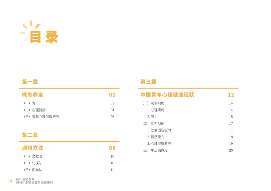 本报告由日慈的全职团队、研究助理、志愿者以及外部专家共同完成,期间得到了周正、姚灏、钱月皎和郜宪达四位审阅专家分别从心理学、精神科与公共卫生、心理治疗和社会工作视角出发所给出的反馈。访谈过程中,还得到了超过五十余名教师、学生以及心理、青年领域从业者的积极配合。