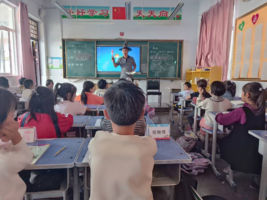 当老师戴着魔法帽子走进教室时,孩子们乐翻了天。虽然很兴奋,注意力也特别集中。第一次教一年级,对于课堂规则用商量的办法来解决,特别好使。印象颇为深刻的是让孩子们选择鼓励口令和安静口令时,每一个人都把小手举得老高,表达自己真心喜欢的内容。在介绍自己及自己的爱好时,孩子们非常开心。