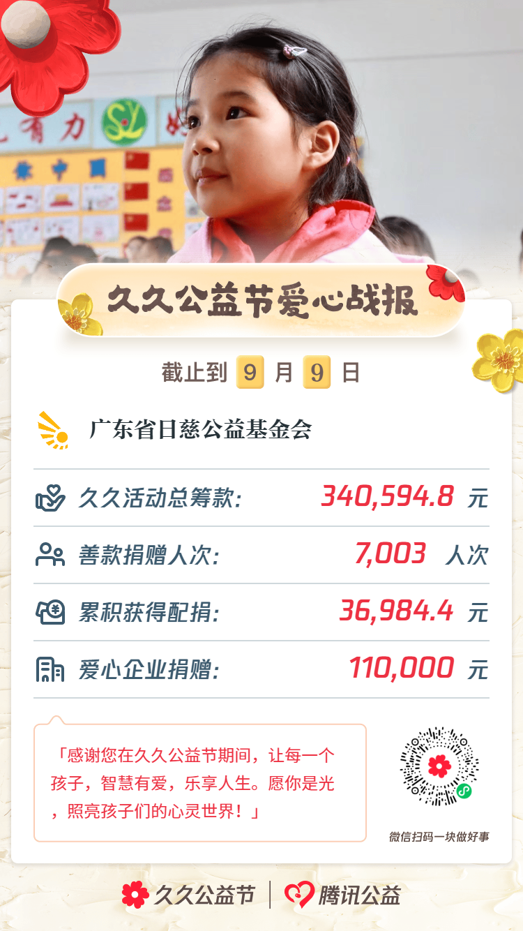 9月5日至9日,在久久公益节五天时间里,我们携手多家爱心企业、儿童友好大使以及项目教师和大学生社团共同发起「一起捐」,300余位儿童友好大使每天助力,截至9月9日24时,共募集了340594.88元善款!其中,累计获得配捐36984.45元,其中爱心企业捐赠110000元,共7003人次参与捐赠。